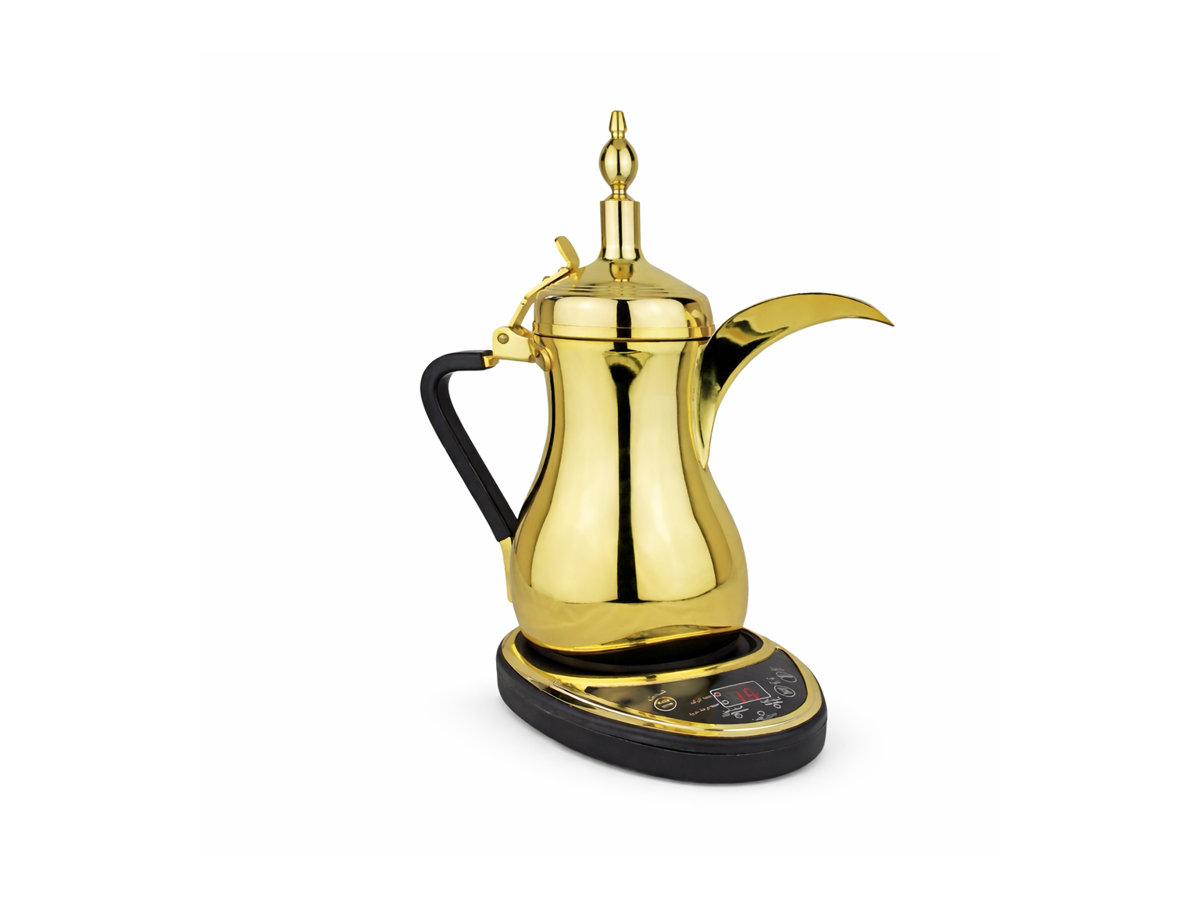 استمتع بكرم الضيافة العربية مع الدلة الكهربائية الذهبية، المصممة خصيصاً لتسهيل عملية تحضير القهوة مع الحفاظ على جودتها ورائحتها الفواحة. تتميز الدلة بهيكل من الستانلس ستيل الفاخر المطلي باللون الذهبي اللامع، مما يضيف فخامة استثنائية لمجالسكم، مع توفير أقصى درجات الأمان والراحة بفضل المقبض المعزول والتحكم الرقمي الدقيق.